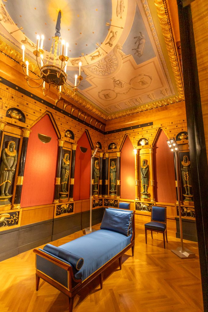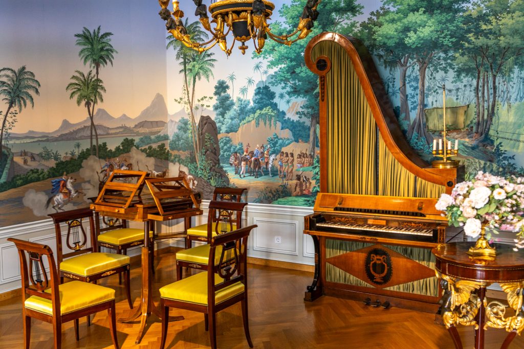 In dieser Epoche hat sich der Stil ganz deutlich verändert, es wird farbenfroh, bunte Teppiche und Tapeten bestimmen das Bild. Besonders gut haben mir die Sitzmöbel und bunten Tapeten im Empiresaal gefallen und auch das Musikzimmer ist wunderschön.