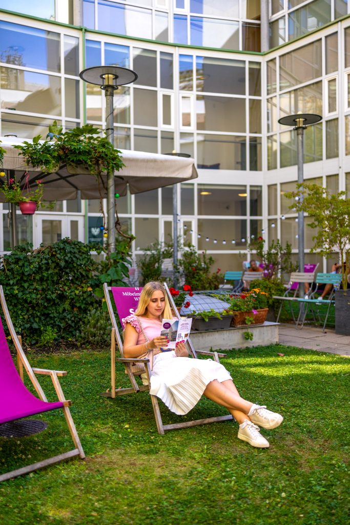 Das Erste, was dir auffällt, wenn du von der Andreasgasse ins Möbelmuseum kommst, ist der wunderschöne Innenhof. Überall Topfpflanzen, wilder Wein an den Mauern, dazu gemütliche Liegestühle und Sitzgelegenheiten, es ist eine richtige kleine Oase, nur ein paar Schritte von der oft lauten Mariahilfer Straße entfernt.