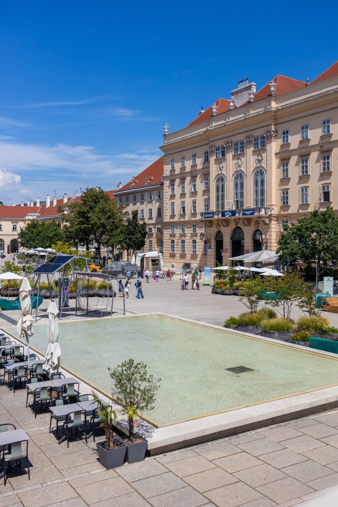 Im Sommer ist hier besonders viel los: mit der MQ Sommerbühne, Cafes und Restaurants. Ein echtes Highlight ist für mich immer die MQ Libelle, die Dachterrasse am Leopold Museum. Der Eintritt ist gratis und du hast einen wunderbaren Blick über Wien und oben wartet sogar eine kleine Bar auf dich.