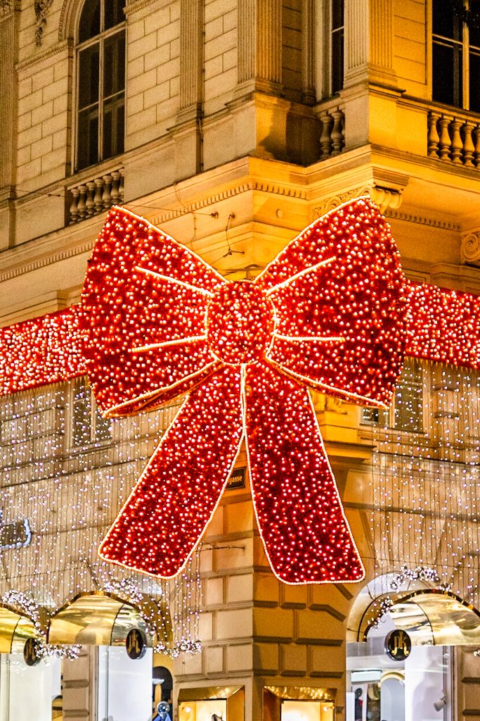 Die Wiener Innenstadt (und auch einige Straßen in den restlichen Bezirken) ist zur Weihnachtszeit wunderschön beleuchtet! Ab Mitte November funkeln und strahlen abends wieder die Lichter und sorgen für eine festliche Weihnachtsstimmung. Die riesigen Kronleuchter auf dem Graben und die vielen Lichter am Kohlmarkt sind meine Highlights! Meine absolute Lieblingsdekoration ist aber die große rote Masche, auf dem Haus Kärntner Straße/Ecke Walfischgasse gleich gegenüber der Oper.