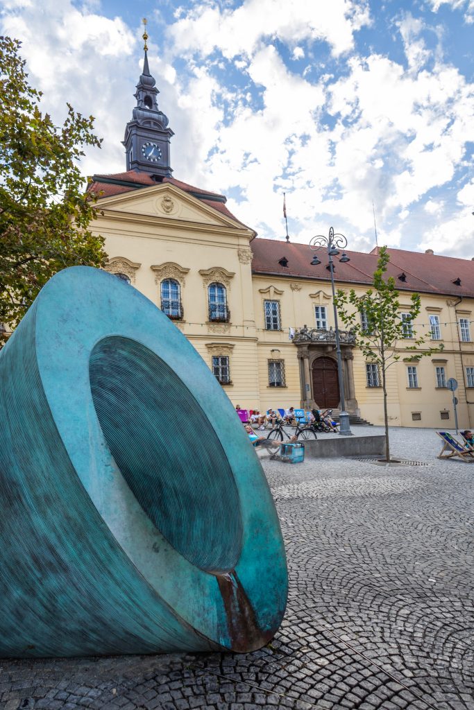 Danach sind wir weiter zum Freiheitsplatz (Náměstí Svobody) spaziert, der lebhafteste und bedeutendste Platz in Brünn. Hier ist immer etwas los und ich finde es schön, dass auch dort wieder die bunten Liegestühle aufgestellt sind. Auf dem Platz steht außerdem die berühmte (und heiß diskutierte) Zeitmaschine in Form eines Projektils aus schwarzem Granit. Jeden Tag um 11 Uhr fällt eine Glaskugel herunter und kommt bei einer von 4 Öffnungen wieder heraus. Der oder die Glückliche, der/die sie ergattert, darf sie als Souvenir behalten. Was ich so beobachtet habe, sind die Plätze aber meistens schon lange vor 11 Uhr besetzt.