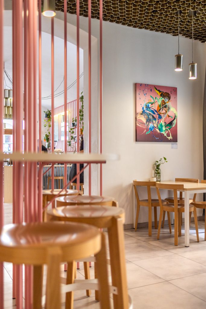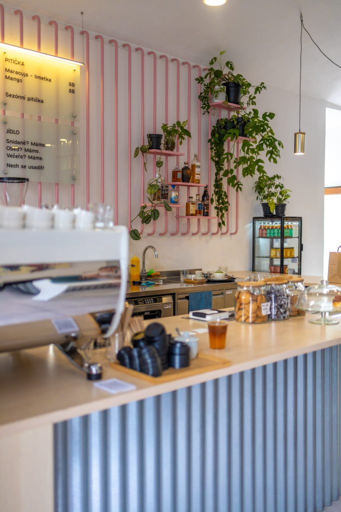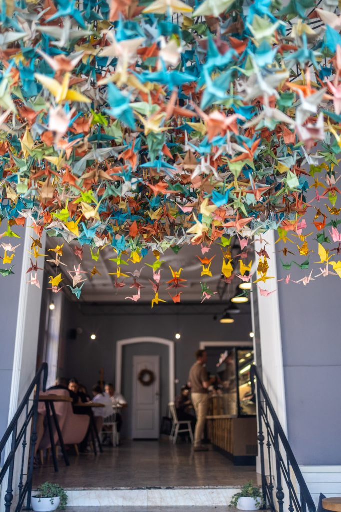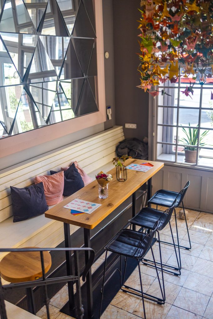 Direkt gegenüber befindet sich „Sorry, pečeme jinak“ (übersetzt: „Sorry, wir backen anders“). Von Gourmet Brno zum Sieger unter den Konditoreien gewählt, mussten wir sie natürlich testen. Von außen ist das Lokal eher unscheinbar, aber innen ein liebevoll gestaltetes Cafe in Rosa-, Braun- und Cremetönen mit dem Highlight: einem großen Origami-Leuchter.