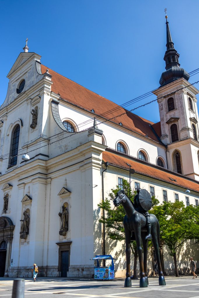 Das Cafe liegt direkt am Mährischen Platz neben der St. Thomas Kirche und der berühmten (und auch umstrittenen) Tapferkeits-Statue von Jošt Lucembrusky, einem Reiterdenkmal mit überlangen Pferdebeinen und einer witzigen Besonderheit. Stell dich einfach unter die Statue und schau nach oben zum Kopf, dann wirst du wissen, was ich meine… 😉