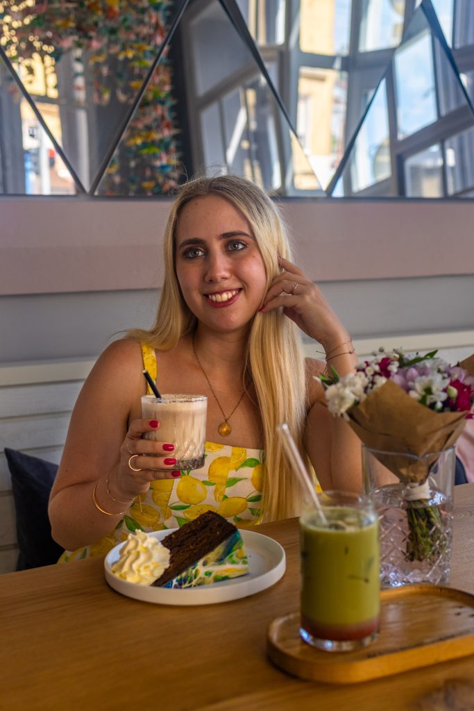 Die Torten sind kleine Kunstwerke: fantasievoll und oft mit ungewöhnlichen Zutaten. Wie wärs z.B. mit einer Moostorte mit Grillen oder einem Bier-Honig-Kuchen? Aber keine Sorge, es gibt auch einige weniger ausgefallene Torten! Ich habe mich für die Sachertorte (179 CZK/~7 €) entschieden (ja, als Wienerin vielleicht nicht die originellste Wahl, aber ich liebe Schokolade). Diese Version war auch etwas anders als die Wiener Version mit saftigen Schokoböden, getrocknete Marillen, Schokoganache und einer Glasur. Es war so köstlich!