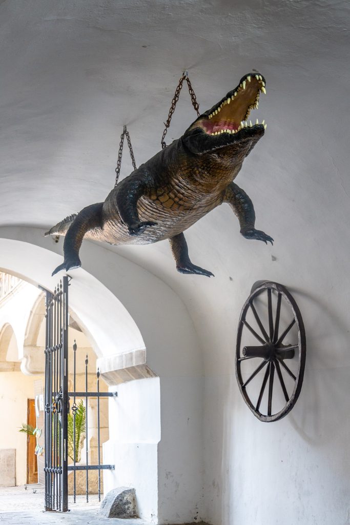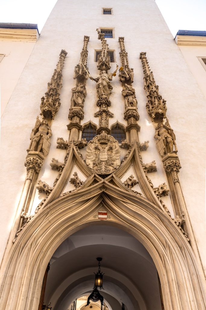 Aber auch das Alte Rathaus selbst ist spannend: Es ist das älteste nicht-kirchliche Gebäude Brünns und steckt voller Legenden. Unter dem Durchgang rechts vom Ausgang des Turms hängt zum Beispiel ein Krokodil, der sogenannte Brünner Drache, der die Stadt angeblich einst in Angst und Schrecken versetzt hat. Und auch das verzierte Portal mit dem gebogenen Türmchen von Anton Pilgram (wir WienerInnen kennen ihn aus dem Stephansdom) solltest du dir ansehen.