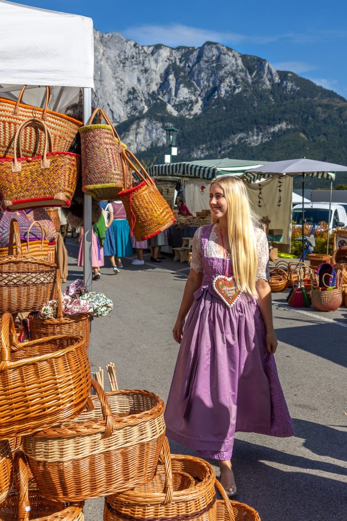 Am Kiritog habe ich die traditionellen Dirndl schon den ganzen Tag bewundert und ich wollte mir nicht die Gelegenheit entgehen lassen, selbst eines anzuprobieren. Da Bad Aussee ja die Trachtenhauptstadt ist, war es natürlich naheliegend, dort auf die Suche zu gehen. Mir wurde das Trachtengeschäft Rastl Gwand empfohlen und ich wurde dort auch wirklich richtig gut und herzlich beraten. Du bekommst dort das traditionelle Ausseer Dirndl und alles, was dazu gehört wie Jacken, Blusen, Haarreifen und mehr. Besonders bekannt ist die Farbzusammenstellung in Grün, Rosa und Lila und genau ein solches Dirndl habe ich anprobiert und mich sofort verliebt. Ein Ausseer Dirndl kann aber prinzipiell alle ganz individuellen Farben haben.