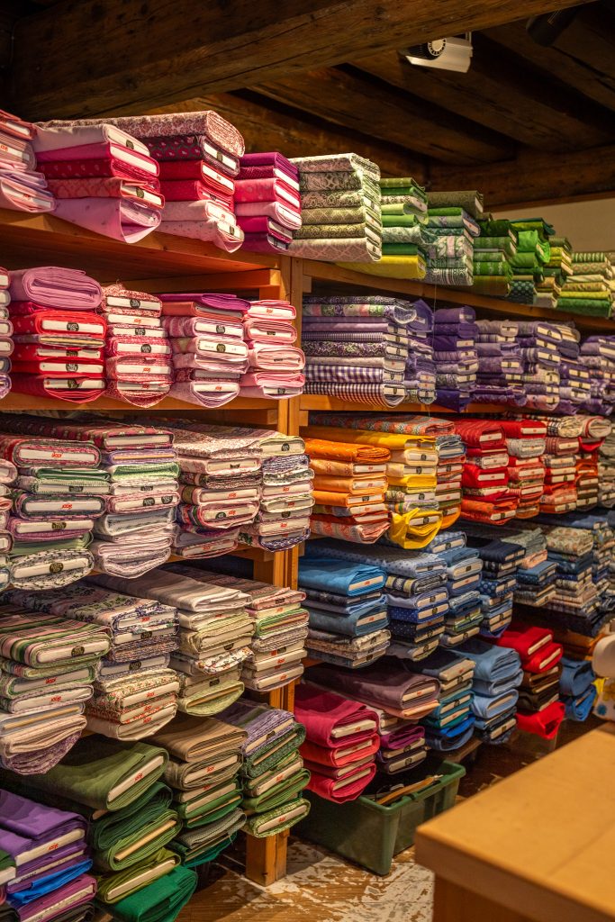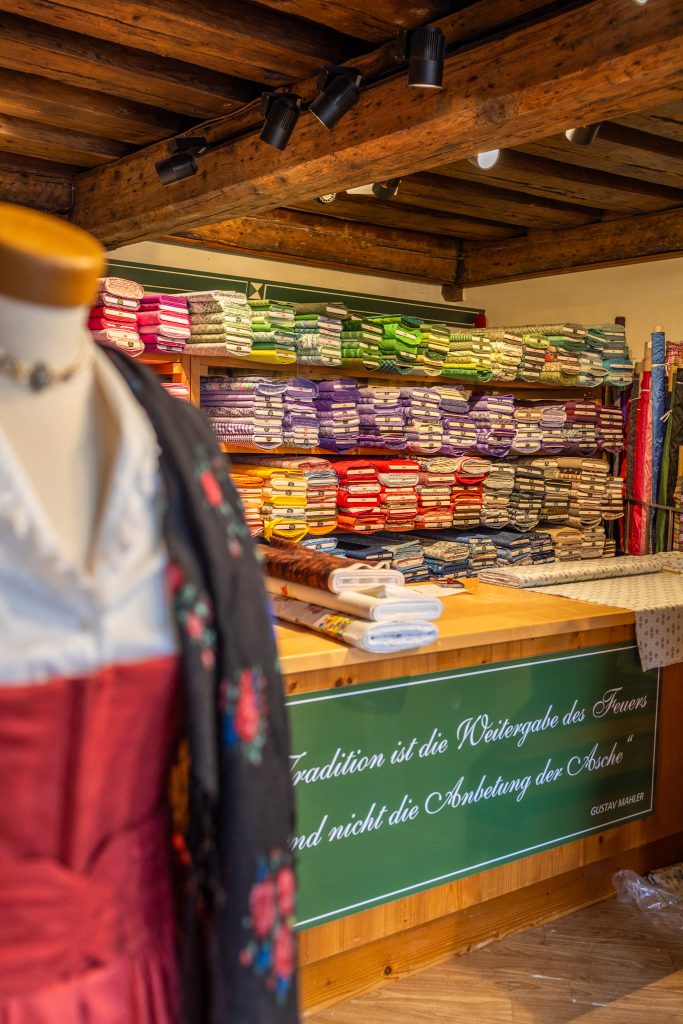 Das Besondere ist aber, dass du dir nicht nur fertige Dirndl kaufen, sondern dir auch dein eigenes Dirndl maßschneidern lassen kannst. Aus einer riesigen Stoffauswahl suchst du dir deine Lieblingsfarben und Muster aus und glaub mir, es gibt so viele schöne Stoffe, dass man sich kaum entscheiden kann.