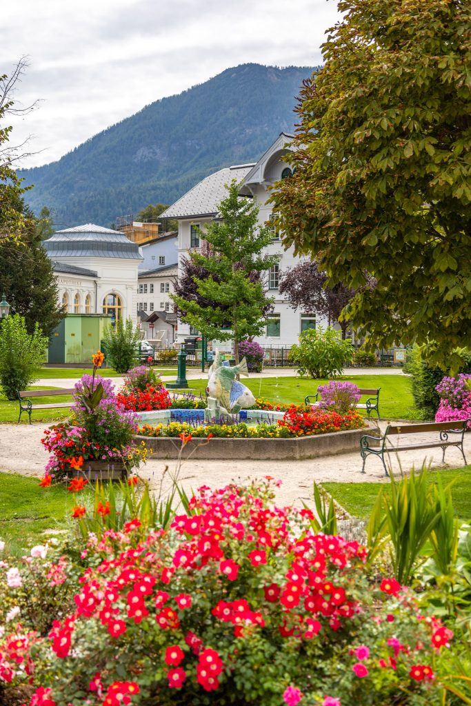 Bad Aussee wurde heuer zur schönsten Blumenstadt der Steiermark gewählt, und wenn man durch den Kurpark spaziert, versteht man sofort, warum. Neben den Blumenbeeten und dem schönen Brunnen findest du hier auch den Mittelpunktstein. Bad Aussee wurde nämlich offiziell als geografischer Mittelpunkt Österreichs bestimmt.